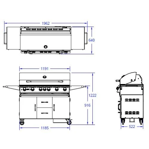 - Maße Grillwagen (HxBxT): 122,2 x 196,2 x 64 cm