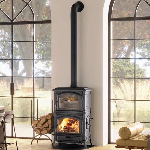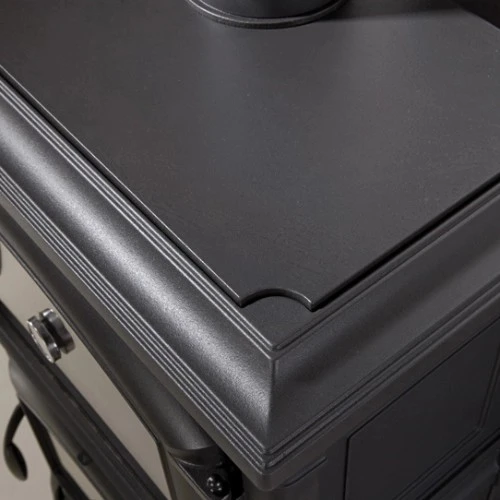 – Holzofen besteht vollständig aus emailliertem Gusseisen. Auch die Feuerraumauskleidung ist aus Gusseisen mit Doppelverbrennung.