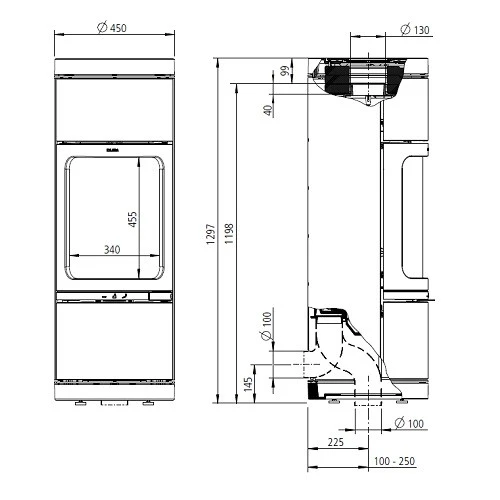 Der Rauchrohranschluss oben mit einer Höhe von 1297 mm und der externe Verbrennungsluftanschluss mit einem Durchmesser von 100 mm sind so konzipiert, dass sie Ihnen maximale Flexibilität bei der Installation bieten.